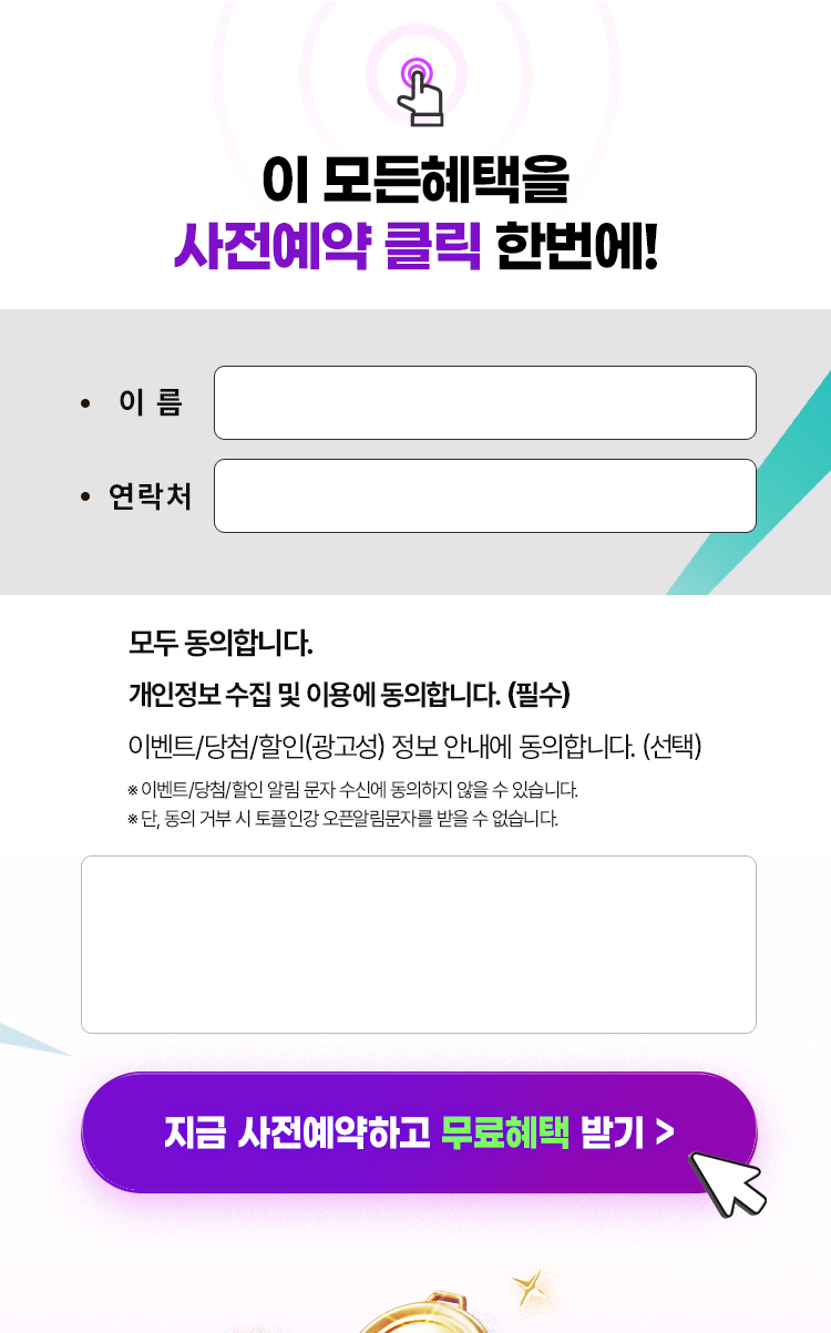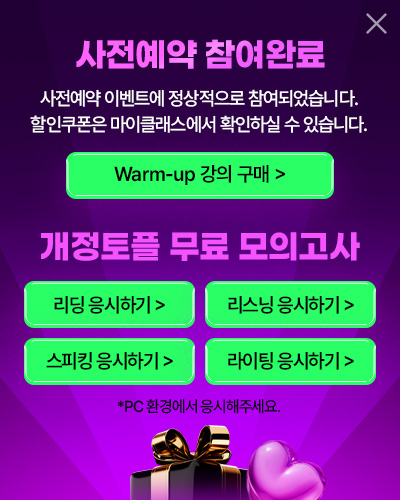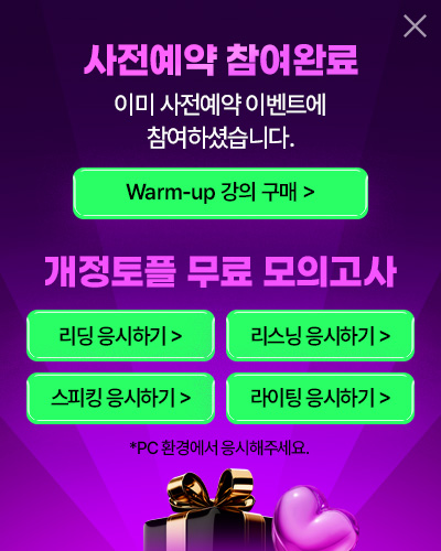 4. 이벤트 신청 회원은 개인정보 이용을 거부할 수 있습니다. 단, 거부의 경우에는 해커스 개정토플인강 사전예약 이벤트 신청이 제한됩니다.